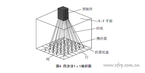 近年來,許多學者對矩形編織材料細觀結構給予了高度的關注,逐步建立了由簡單“米”字型到三維實體的單胞幾何模型,推動著力學模型的發展。鄭錫濤和葉天麒[13]系統地研究了四步法1×1方型編織工藝編制的預成形件及其增強的復合材料的細觀結構。提出了紗線橢圓形橫截面假設,考慮了編織紗線的細度和編織紗線填充因子的影響,創建了正軸模型。根據編織過程中攜紗器的運動軌跡特點,將預成形件劃分為三個不同的區域,分別定義了不同的控制體積單元,識別了編織結構參數之間的關系,同時給出三維編織復合材料的設計方法,三維編織示意圖見圖4。馮偉和馬文鎖[14]將編織物中連續的紗線離散開來并用特殊的點符號表達,用點群和空間群分析現有編織材料幾何結構,一方面可以合理地對現有編織材料幾何結構進行描述和分類;另一方面也可以將該理論用于推導編織材料幾何結構新的和更為有效的編織方法。張美忠等[15]由于編織復合材料實際結構的復雜性,為了使研究結果更真實,用現有成熟的有限元軟件仿真三維編織復合材料,并研究其各項力學性能已成為一種趨勢。