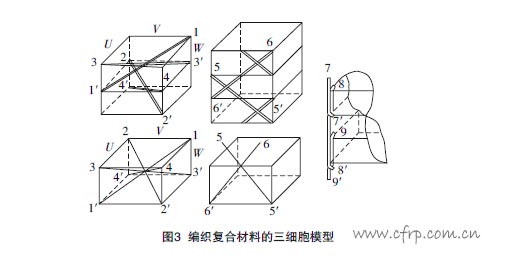 三維編織復合材料的力學模型是以上述細觀結構的幾何模型為基礎的。20世紀80年代至今,代表性的工作有Ma和Yang等的彈性應變能法、Yang和Ma等的纖維傾斜模型、吳德隆和郝兆平的三細胞模型、陳利的偏軸模型和鄭錫濤的正軸模型。90年代后期,梁軍等[16]應用Eshelby 和Mori-Tanaka理論對三維編織復合材料進行了細觀力學分析,然后與剛度平均化方法相結合,對含圓幣型基體微裂紋的三維編織復合材料彈性常數進行了理論預報。孫慧玉[17]借鑒國外模型發展了纖維傾斜模型,考慮厚度方向的效應,采用三維應力-應變分析,預報了有效彈性模量,并將此空間多向層合板力學模型引入到了強度性能的預報。王波等[18]提出了剛度合成法預報編織復合材料剪切彈性模量,比較了整體編織試件和裁剪所得試件的理論剪切性能,分析了剪切性能隨試件沿寬度和厚度兩個方向內部單胞數目的變化規律。目前也有關于編織復合材料彈性性能、損傷、強度以及在超常環境下性能的工作報道。陳利和陶肖明等[19]基于變分原理,提出用有限多相單元法來預測三維編織復合材料的彈性性能。劉振國和盧子興等提出了一種預報編織復合材料剪切性能的“米”字型體胞的有限元計算模型[20]。黃爭鳴[21] 建立了“橋接模型”并分析了編織復合材料的剛度和強度性能。徐焜和許希武[22]基于八邊形纖維束截面單胞模型,采用細觀非線性有限元方法,建立了三維四向編織復合材料的漸進損傷拉伸強度模型。曾濤等[23-24]利用四纖維體胞模型,提出了一種多相有限元數值法,基于Tsui-Wu失效準則和Mises準則預報了三維編織復合材料的非線性響應和損傷演化。Alzina[25]等用多尺度分析方法預報了低溫下編織復合材料的熱彈性性能。 123,123