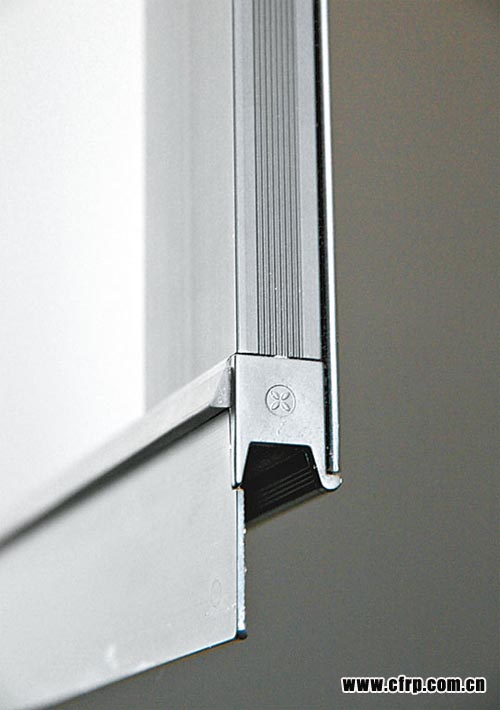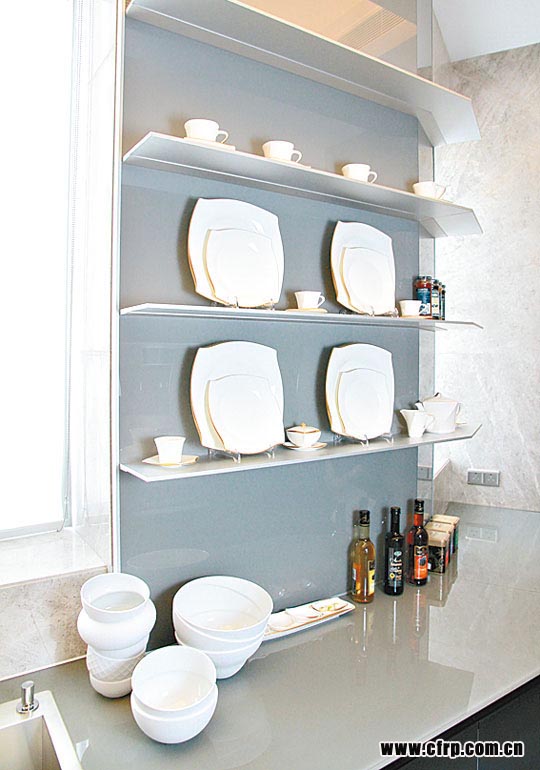 廚櫃另一邊特設(shè)掛牆式層架,用以存放餐具,層架由蜂巢式結(jié)構(gòu)鋁合金骨架所製,看似單薄,卻堅固穩(wěn)陣。