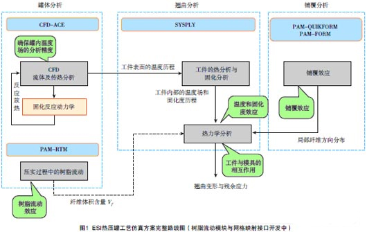 復合材料的熱壓罐成型工藝過程是一個涉及對流換熱、結構熱變形和固化相變反應的復雜物理化學過程。完整的熱壓罐工藝分析方案應考慮的因素應包括: