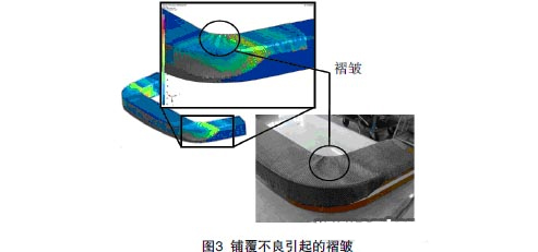 預浸料在曲面上的鋪覆過程會對增強體造成剪切和擠壓,從而導致纖維鋪設角度發生變化,當剪切角超過預浸料的極限角時甚至可能引起褶皺(圖3)。纖維角度的 變化會引起局部熱膨脹系數和模量的改變,從而對最終的翹曲變形和殘余應力分布造成影響。顯然,鋪覆作用的影響程度受工件幾何形貌的影響,對于曲率較大的工 件,這種作用的影響相對顯著。