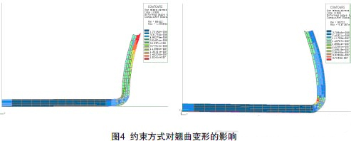 在固化變形分析中,熱膨脹與固化收縮決定了預浸料應變能的水平,而預浸料的約束方式則直接決定了殘余應力在結構上的分布狀態。殘余應力在厚度方向上分布的 不平衡導致了結構的翹曲變形。圖4為采用相同預浸料,經歷相同的溫度歷程,在不同約束方式下的兩個L型件的變形計算結果。左圖L 型件外側施加全約束,固化結束后釋放約束;右圖L型件內側施加全約束,固化結束后釋放約束。可見,采用不同的約束方式將顯著影響最終的變形結果。