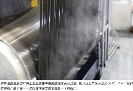 碳纖維生產需要消耗大量的電能,這也是碳纖維增強復合材料高成本的原因之一,而傳統耗時的熱壓罐式生產工藝也是這家汽車制造商急切想摒棄的。摩西湖市的工廠有兩條183m長的生產線,產線上的多重電加熱氧化和碳化爐用于將聚丙烯腈聚合物原料的絲束,也稱為原絲,轉換成鍵合在一起的碳原子晶體。
