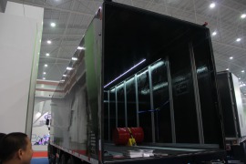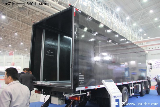 遭遇最多人圍觀的就屬碳纖維箱體車了,該車采用廣汽日野底盤,碳纖維材質的9.6米車廂僅重1.6噸,底盤采用貫穿梁設計,加上較薄的碳纖維車廂,箱體容積達64.6立方米,配合液壓圍板車輛裝卸貨效率更高。外形上碳纖維材質箱體,配合花紋,也顯得相當漂亮大氣。