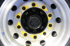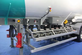 四軸鋁合金油罐半掛一下吸引住了小編的眼球,繞車一圈該車在設計上與國內車型明顯不同,經詢問該車主要出口馬來西亞,泰國等,還值得一提的是該車也配了輪胎緊固標。