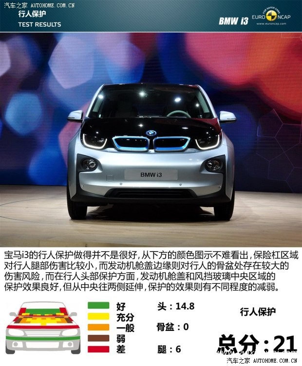 在此之前的測試,寶馬i3的表現都比較穩定,如果這樣的狀態能夠延續至行人保護和主動安全系統這兩項測試中,那么,拿到五星成績應該不成問題,下面,我們看看究竟是在哪些細節損失了分數。