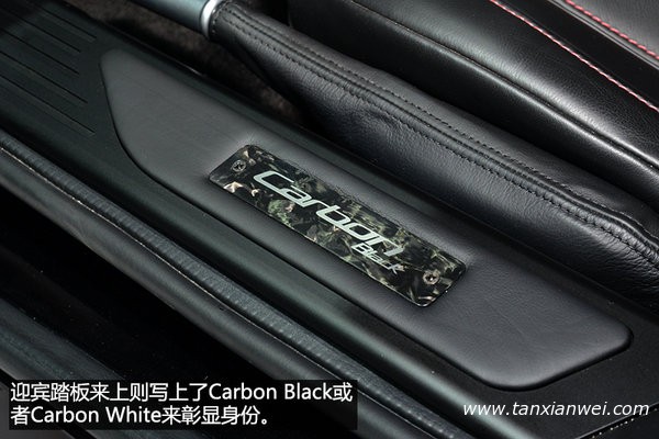 兩款車內飾均采用了全黑設計,并應用一些紅色元素來與外觀的紅色制動卡鉗進行呼應,比如搶眼的紅色換擋撥片以及細膩的紅色針腳等等。迎賓踏板來上則寫上了Carbon Black或者Carbon White來彰顯身份。