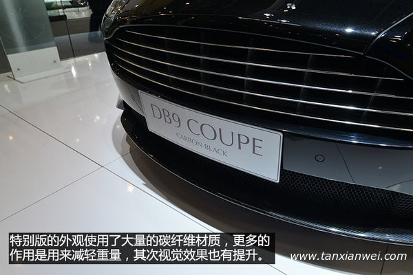 在本屆車展上,阿斯頓·馬丁帶來了一款DB9Carbon Black車型,其實這款特別版還有一款白色車身的車型Carbon Black,但本屆車展只有這款黑色外觀,下面我們就來看看這款特別版有那些特別之處。