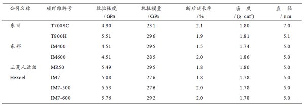 通用級T300碳纖維其CFRP可用來制造飛機的二次結構部件。例如,T300/5208用來制造B757、 B767和B777的二次結構部件。但因T300的抗拉強度僅為3.53 GPa,抗拉模量為231 GPa,特別是斷后延長僅有1.5%,滿足不了制造一次結構件的要求。隨后開發成功的高強中模型(Intermediate Modulus)碳纖維在上述3項質量指標有了大幅度提高,在配套韌性環氧樹脂所制高性能CFRP就可用來制造大飛機的一次結構件。表1列出了高強中模碳纖維的主要品牌及性能。