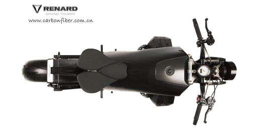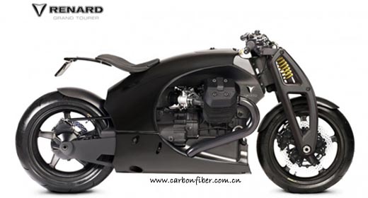 The Renard GT’s carbon-fiber monocoque weighs only 11 kilograms, and is reinforced with Kevlar, to make it resistant to impact and vibration. The unibody integrates the motorcycle’s frame, gondolas, petrol tank and air box into a single load-bearing structure. The sleek, no-nonsense exterior gives the Renard its distinctive appearance.