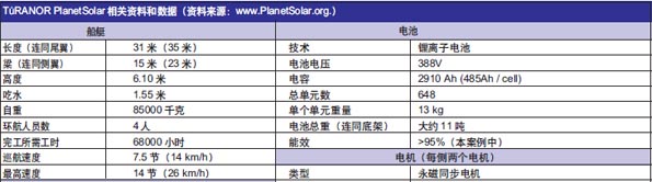 該雙體船上裝有500m2以上的太陽能模塊。這些光伏單元安裝在甲板和尾板的外表面上。但是最大的挑戰之一還是如何存儲足夠的太陽能,以便船能夠在黑暗中保持航行。為達到這一目標,該船使用了最新的鋰離子電池,總重大約11噸。這些電池分別安裝在左側和右側的船體上。