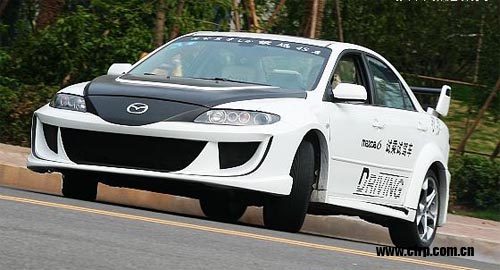 馬自達(dá)6改裝的碳纖維引擎蓋上的兩個網(wǎng)狀出氣口更是如虎添翼,如同黑馬的兩個鼻孔。