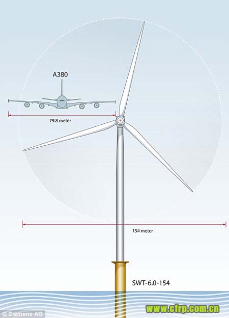 報道稱,這座目前世界上最大的風車是由德國西門子公司開發的大型風力發電機,擁有三片長度達到75米的扇葉,僅僅比空客公司的巨無霸客機A380的翼展(79.8米)略短。報道稱,這座大風車將于2014年矗立在臨近英國埃塞克斯郡海岸的水中。