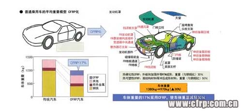 例如,按照碳纖維協(xié)會(huì)的推算,普通乘用車的平均車體重量為1380kg,如果盡可能采用CFRP部件,重量大約可以減輕30%,達(dá)到97Okg。CFRP的使用量占車體重量的17%左右,約為165kg,這樣一來,如果10年的行駛距離為9.4萬km,二氧化碳排放量可以減少5噸。