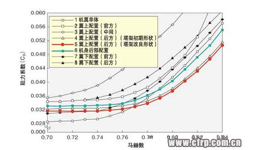 馬赫數接近0.8後,阻力係數激增。商用噴射飛機慣用的機身後部配置(6)與翼上配置相比,在圖上的所有區域,翼上配置的前方(2)和中間(3)的阻力係數均偏大,但HondaJet採用的後方位置(4、5)所有區域的阻力係數都小於機身後部配置。