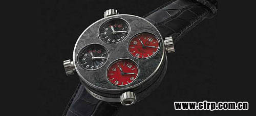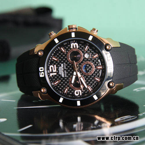 碳纖維手表除了材質本身的魅力,在設計上也力求創意和精巧,將碳纖維優勢由內而外地發揮出來。在《Style Carve》雜志推薦的十款性感的男士碳纖維腕表中,位列第一、最受青睞的就是 布雷博(Brembo)的Quattro Valvole CCM。碳纖維的黑色經典表面上,張揚的兩黑兩紅共四個小表盤非常醒目。設計的靈感來自于四氣門發動機的汽缸頭,在四個氣門的位置各自安裝了獨立的手表機芯。該款手表并不是布雷博自己推出的,而是聯合意大利著名手表廠商麥卡尼克·費洛奇(Meccaniche Veloci)共同推出的,亮相于2009 巴塞爾鐘表展上,售價為15000美元左右。這款表的顏色也做了大膽的嘗試,除黑色外,還有黃色、紅色和銀色。