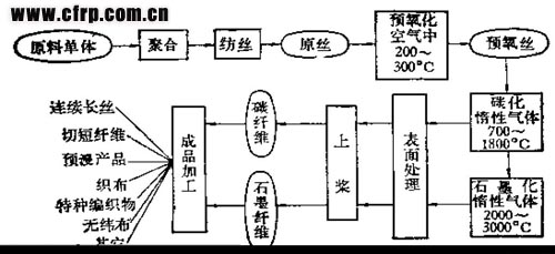 如下圖1所示,PAN基碳纖維的生產,從原料單體到原絲、再到碳纖維成品加工,各道工藝的緊密相連,可以在一個車間內連續(xù)的完成全套工藝流程。