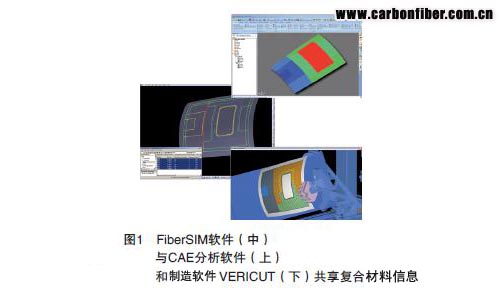如圖1 所示,在CATIA V5 設計進程中,VISTAGY 的FiberSIM® 軟件、應力分析的MSC 軟件SimXpert 有限元模型、用于為自動鋪絲機生成制造數據的CGTech VERICUT 復合材料編程及仿真軟件無縫共享復合材料機身壁板的鋪層信息。