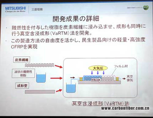 三菱電機開發出了碳纖維增強樹脂(CFRP)復合材料制造技術。其能以低成本制造輕量的阻燃性CFRP復合材料,并在2014年2月13日舉行的三菱電機研發成果發布會上公開了樣品等。今后,三菱電機將把這種材料用于風機扇葉及電梯護板等工業設備部件。