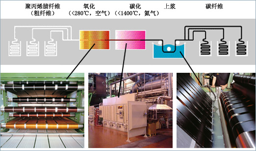 Carbon fibers are manufactured from PAN fibers by an industrial process. They are suitable for a wide range of applications. 碳纖維由聚丙烯腈纖維經過工業工藝制成,適用范圍廣泛: Production: