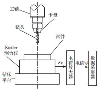鉆削碳纖維增強復合材料,一般采用高轉速和低進給量。本試驗采用高速臺鉆Z4006A,具有1370r/min、3700r/min、6900r/min、10000r/min 四級轉速,滿足鉆削時高轉速的要求。為了全面研究各類工藝參數對鉆削軸向力和制孔質量的影響,作者對該鉆床進行了改進。在鉆床上加上步進電機實現鉆床自動進給功能,進給量可大范圍調整。圖5為碳纖維增強復合材料鉆削軸向力測量平臺示意圖。