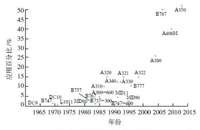 碳纖維增強復合材料(CFRP)是以碳或石墨纖維為增強體的樹脂基復合材料。因其具有比強度、比剛度高,耐疲勞性能好及可設計性強等優點,在航空航天領域中廣泛應用,已發展成為繼鋁、鋼、鈦之后的第四大航空航天結構材料之一。碳纖維增強復合材料在大飛機上的用量直線上升,歷年應用情況見圖1。