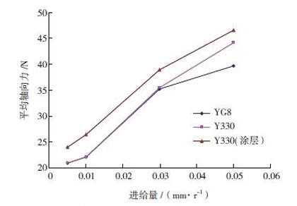 圖7為直徑3.5mm 的YG8、Y330 和Y330(涂層)鉆頭在不同鉆削參數下鉆削碳纖維復合材料的軸向力曲線圖??梢钥闯觯?種鉆頭鉆削的平均軸向力都隨著進給量的增大呈現的增大趨勢。在相同的參數下,軸向力相差不大,這是因為3 種刀具同為YG類硬質合金,性能相似。
