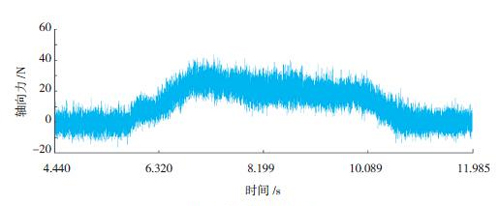 鉆頭鉆削碳纖維增強復合材料時,產生一個向下的軸向力,Kistler9257A測力儀將力信號轉換成電信號,經Kistler5019電荷放大器放大后,由數據采集器和專用測力軟件3010DEWE在計算機上形成動態軸向力曲線圖,如圖6所示(主軸轉速n=6900r/min,進給量f=0.01mm/r)。