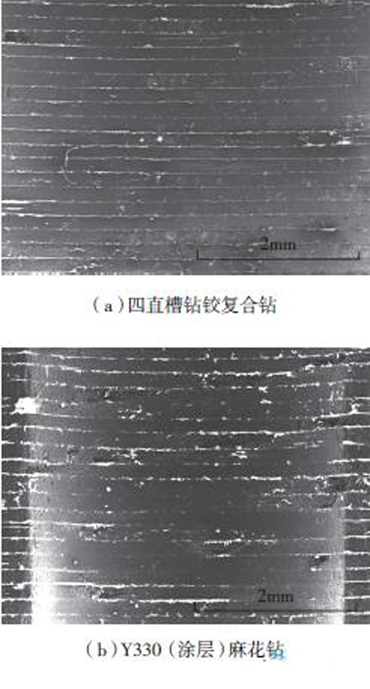 選用6.7mm四直槽鉆鉸復合鉆和6.0mmY330(涂層)麻花鉆進行了試驗。四直槽鉆鉸復合鉆鉆尖處沒有了阻礙切削的橫刃,有利于減小切削力,同時還能鉸孔,不僅精度高而且效率也高。圖11為電子顯微鏡下四直槽鉆鉸復合鉆與Y330(涂層)麻花鉆所鉆孔的孔壁形貌(n=1000r/min,f=0.056mm/r)。