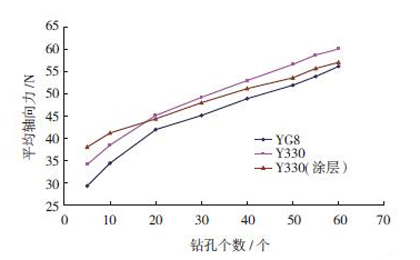 隨著鉆孔數的增加,3種鉆頭的軸向力逐漸增大。這是因為隨著鉆孔數的增加,鉆頭磨損量增大,從而導致軸向力增大。比較有涂層的和無涂層的Y330鉆頭的鉆削前20個孔的平均軸向力,Y330(涂層)平均軸向力略大于Y330。這是因為:涂層之后,刀具切削刃變鈍。但在鉆過一定孔數量(20孔)之后,Y330(涂層)平均軸向力小于Y330,說明涂層材質很好的提高了刀具的耐磨性。