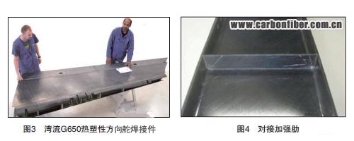 熱塑性復合材料主結構件是一個過去即有涉獵的領域。灣流G550和G650 飛機的壓力艙壁板(圖2)是一系列帶壓力成型加強肋的碳/聚醚酰亞胺。空客A400M 的駕駛艙地板就是用熱塑性復合材料制造的。最近,已經著手焊接主操縱面。新型灣流G650 公務機(JEC2010 創新獎得主)的方向舵和升降舵就是感應焊接的多肋扭力盒結構(圖3)。