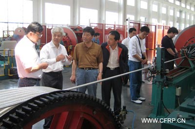 此外,還需要增韌改性,使所制芯棒具有韌性,而不是硬棒。否則不會通過放線滑輪試驗。連續拉擠成型是成熟工藝。但制造碳纖維復合芯棒具有一定的特殊性。簡單的工藝流程是:將碳纖維筒放在整理架上,單向(0°)集束,包覆玻璃纖維,浸漬環氧樹脂膠液,通過鋼制模口,以控制直徑,然后通過固化爐,固化成型。芯棒直徑可在0.19~19mm范圍內調節,拉擠速度可在2.7-18m/min范圍內調節。