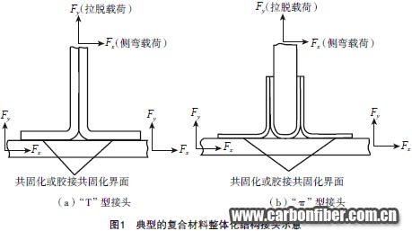 復合材料結構件中,不同結構組分可通過共固化或膠接共固化途徑結為一體,以取代緊固件連接方式。此狀態下,在共固化或膠接共固化界面周邊,形成一個特殊的接頭區。所謂復合材料整體化結構,即為內含此類接頭的復合材料結構型式,圖1給出了典型接頭及其載荷示意。