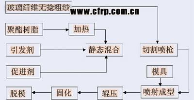 圖4所示為噴射成型工藝(Spray Up Molding)示意圖。該工藝是將混有引發劑和促進劑的兩種聚酯分別從噴槍兩側噴出,同時將切斷的玻纖無捻粗紗由噴槍中心噴出,使其與樹脂在空間均勻混合后沉積到模具上。當沉積到一定厚度時,用壓輥滾壓使纖維浸透樹脂,排除氣泡,在經常溫固化后成型為汽車復合材料制品。噴射成型工藝是在手糊成型工藝的基礎上發展起來的。由于該工藝是借助于機械的手工操作工藝,因此也被稱為“半機械手糊成型工藝” 。圖5所示為該工藝的工藝流程。