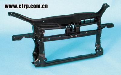 LFT-D成型工藝的優點主要有兩個:一是成本低。由于是直接一步法生產,因此由LFT-D生產的大型結構部件比兩步法生產的GMT或LFT-G壓制部件的成本低20%~50%;二是制品的綜合性能優異。LFT-D壓制成型制品的抗沖擊性能比GMT稍低一些,但由于比LFT-G成型后的纖維長很多,因此其抗沖擊性能明顯比LFT-G高得多。另外,大量的研究表明,LFT-D注塑的生產效率比采用標準LFT-G粒料的生產效率高,因為LFT-D低的塑化要求改善了纖維被剪斷的可能性。對于成型周期超過1min的部件,用LFT-D注塑設備在30s內就能完成。LFT-D成型工藝的缺點主要是制品廠需要加大對LFT-D成型工藝以及材料、配方等的研究投入。圖17所示為采用 LFT-D生產的2003 大眾 Golf V前端框架。