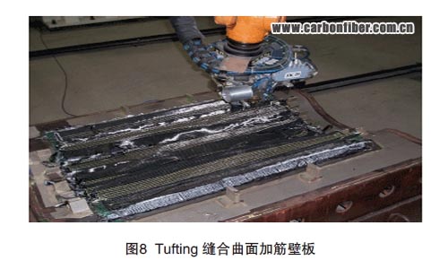 縫合時縫線幾乎處于自由狀態,張力很小,僅靠縫線與預制體的靜摩擦力把縫線留在預制體內部。因此,為了能保證縫線能順利留在預制體內部,會在預制體鋪疊時加入少量定位膠黏劑來增大預制體與縫線的摩擦,從而保證縫合的順利進行。在縫合泡沫夾芯預制體時,定位膠黏劑作用不明顯,可以在預制體底部加襯一層薄橡膠,以達到留住縫線的效果,縫合完成后再取下橡膠。對于相對較薄的預制體也可以采用此種方法來提高Tufting縫合質量。圖8是采用Tufting技術 縫合曲面加筋壁板。