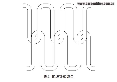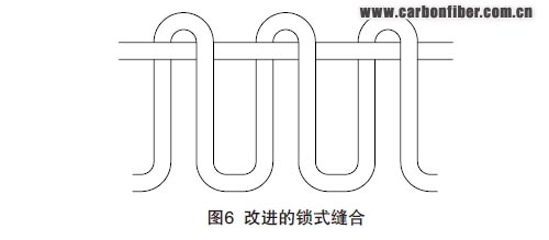 (1)鎖式縫合(改進鎖式縫合)。因其工藝性較好在復合材料預制體研制中得到廣泛使用。傳統鎖式縫合方式較常見,其特點是縫線和底線的結點在制件厚度的中間位置,這對于復合材料來說,結點處的應力集中很大程度上會影響復合材料性能的提高。因此,在傳統鎖式縫合的基礎上進行工藝優化,出現了改進鎖式縫合,圖6即為改進的鎖式縫合。在復合材料縫合中,改進鎖式縫合應用較多,使用此縫合方式制件在厚度方向縫合線彎曲少,對面內纖維的損傷少,由縫合引起的應力集中也較小,因此使復合材料具有相對更高的損傷容限。 內容來自123456