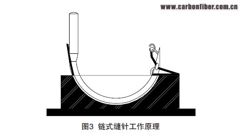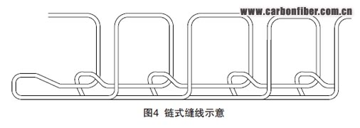 (2)鏈式縫合??p頭固定于懸臂機械手上,依靠機械手來完成復雜的縫合動作。因此,鏈式縫合可以完成所有復雜曲面預制體的縫合,但由于縫針為彎月形縫針,所以鏈縫通常適用于相對較薄的預制體。鏈式縫合的最大縫合厚度為10mm,當纖維預制體厚度小于1mm,且零件型面曲率較大時,在雙面縫合工作平臺的限制下無法使用鎖式縫合;而對于Tufting縫合,因為零件較薄,縫線不易留在零件內,所以對于此種預制體的縫合最好采用鏈式縫合方式。 本文來自123