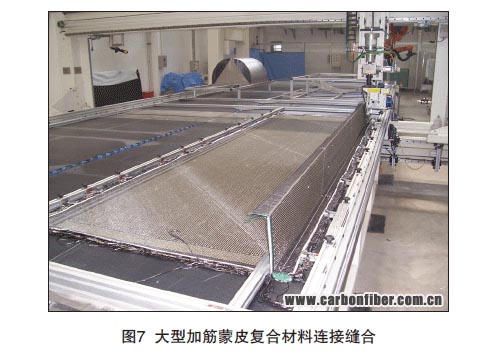鎖式縫合因其受雙面縫合的工作原理所限,對預成型體的縫合工作只能在縫合設備工作平臺上完成,所以通常此種縫合方式只適用于曲率相對較小的預制體上,縫合厚度可達20mm。鎖式縫合對縫線的張力可做相應調節,因此在沒有特殊定位要求的情況采用鎖式縫合無需對預制體使用定位膠粘劑。通過調節鎖縫,復合材料加強筋與蒙皮連接的結構應用鎖式縫合較多,在靠近立筋的縫合區需要更換小壓腳來保證縫針靠近加強筋根部從而完成縫合。圖7為應用鎖式縫合對復合材料大型加筋蒙皮的連接縫合。