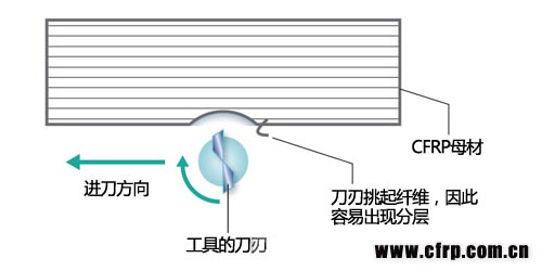 2]工具的旋轉(zhuǎn)和進(jìn)刀方面,加工CFRP特別需要注意的是工具的旋轉(zhuǎn)方向和進(jìn)刀方向。因為由預(yù)浸材層疊而成的CFRP具有各向異性。