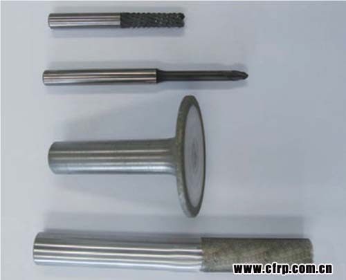 上面的兩個是通過CVD(化學(xué)氣相沉淀)涂布了金剛石的超硬合金立銑刀,屬于市售工具。下面兩個是電沉積了金剛石砂粒的工具,是在工具廠商協(xié)助下自制的工具。 本文來自123