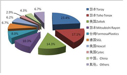 由于碳纖維生產工藝復雜、技術含量高,加之政治因素限制技術和設備等引進,目前全球碳纖維技術和生產仍主要控制在日本和美國手中。全球可實現碳纖維產業化的國家和地區不足20個;規模化生產企業不超過12家。日本東麗、日本東邦、美國卓爾泰克、日本三菱麗陽是全球碳纖維產能排名前四的生產商,這四家分別占全球碳纖維總產能的23.4%、17.1%、14.3%和10.3%,而中國企業僅占4.3%。